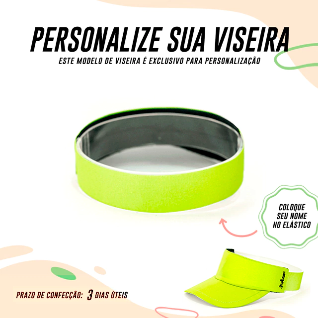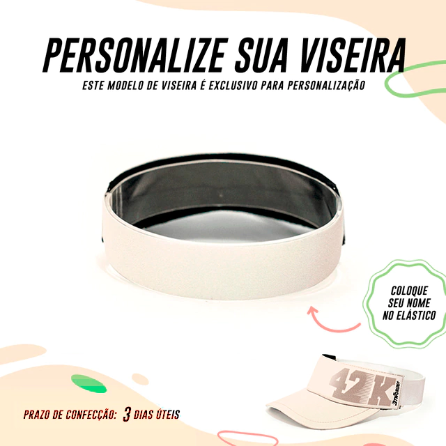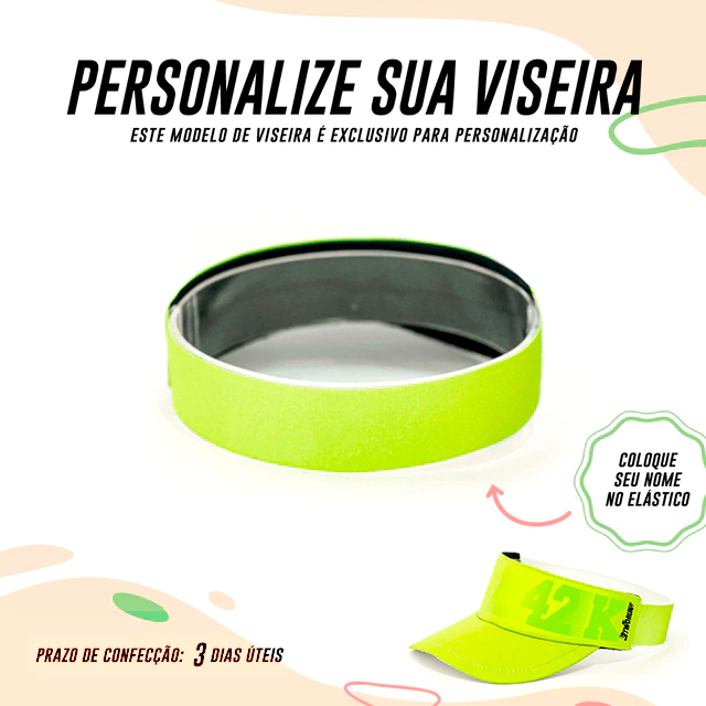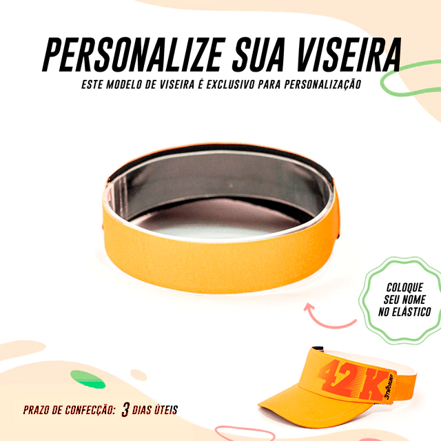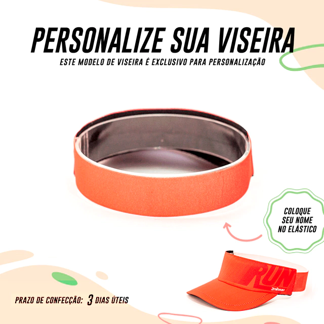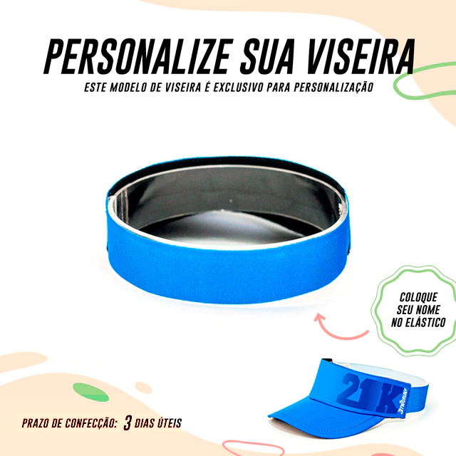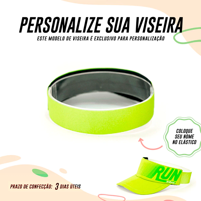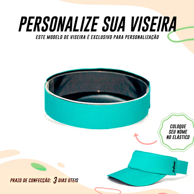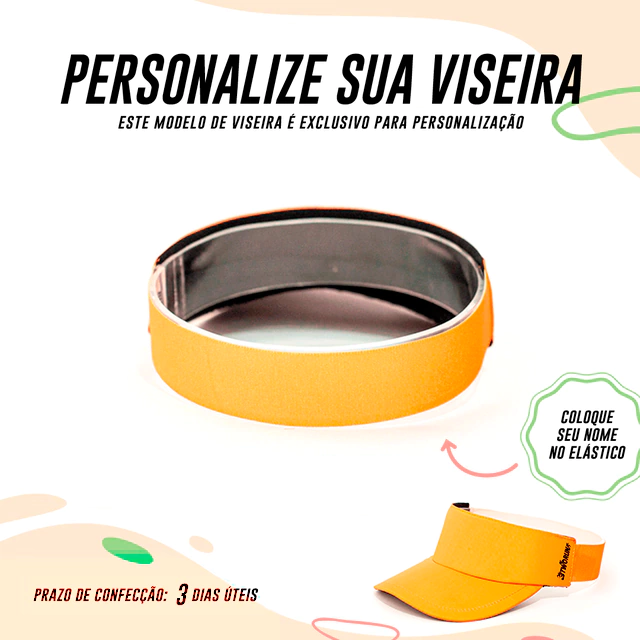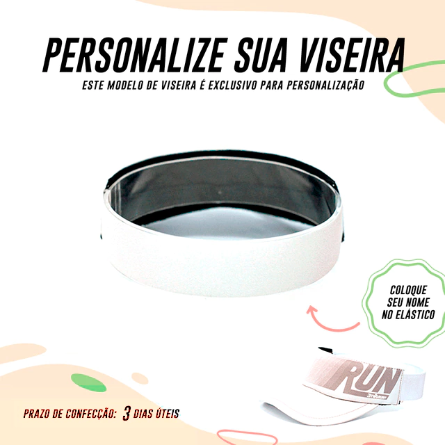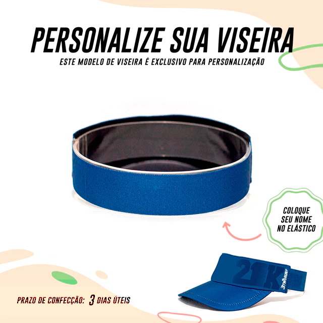 Agora você pode criar a sua viseira com o seu nome descrito nas COSTAS. Lembrando que: TODAS as viseiras da 3TwoRun são confeccionadas com tecido de microfibra, de secagem rápida, com a parte interna atoalhada, a aba é feita com material expandido que não quebra e com elástico que se ajusta na sua cabeça.