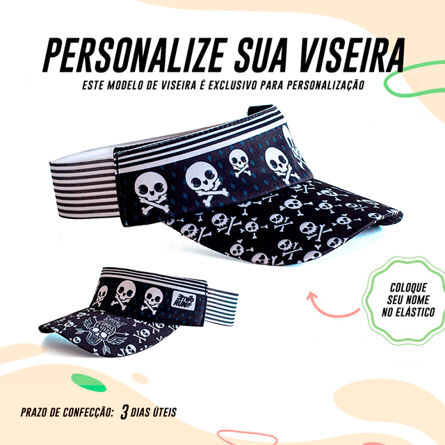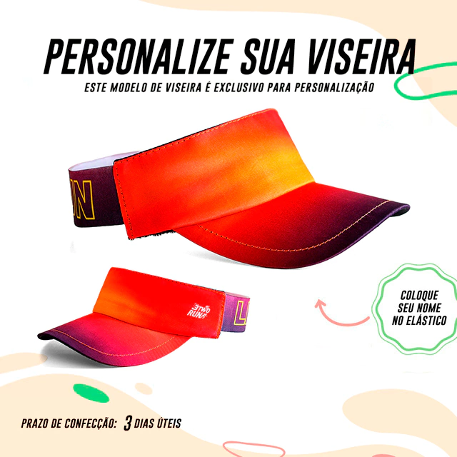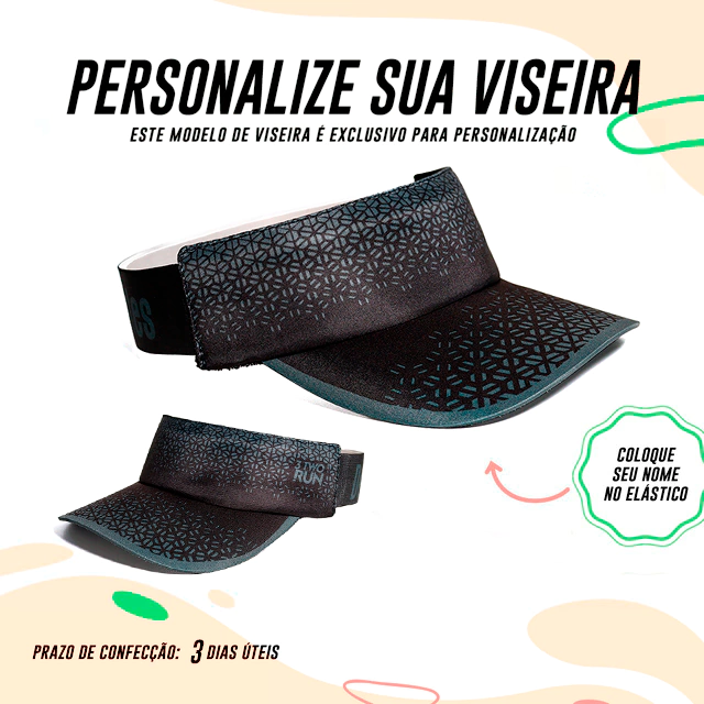 Agora você pode criar a sua viseira com o seu nome descrito na LATERAL E COSTAS. Lembrando que: TODAS as viseiras da 3TwoRun são confeccionadas com tecido de microfibra, de secagem rápida, com a parte interna atoalhada, a aba é feita com material expandido que não quebra e com elástico que se ajusta na sua cabeça.
