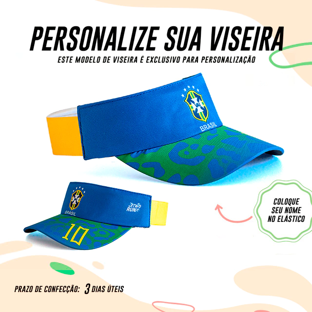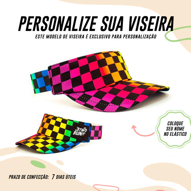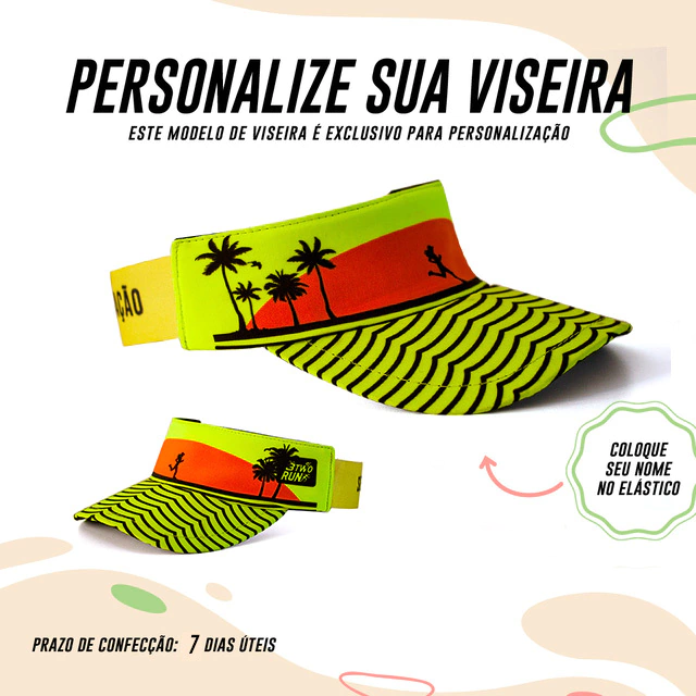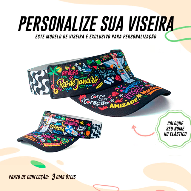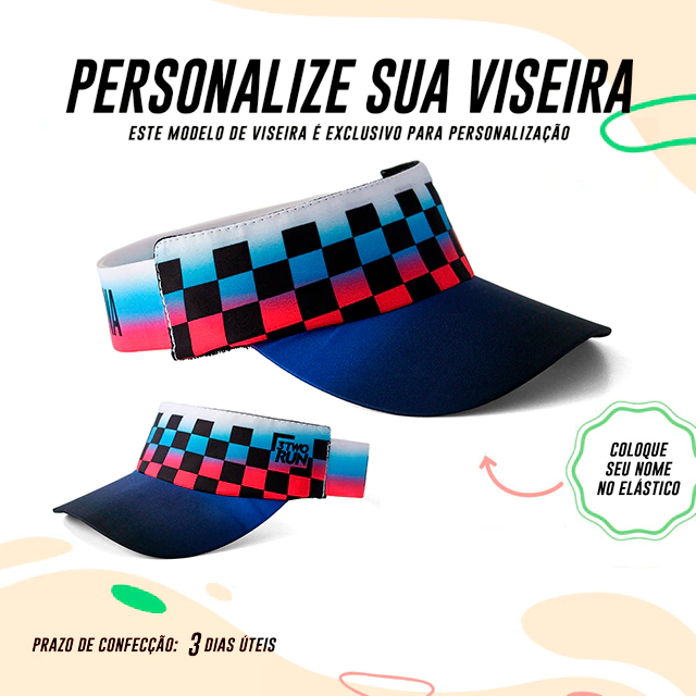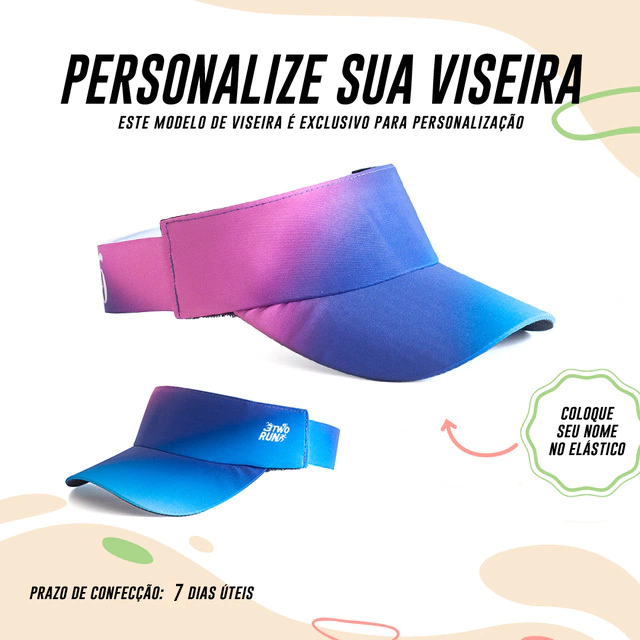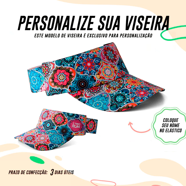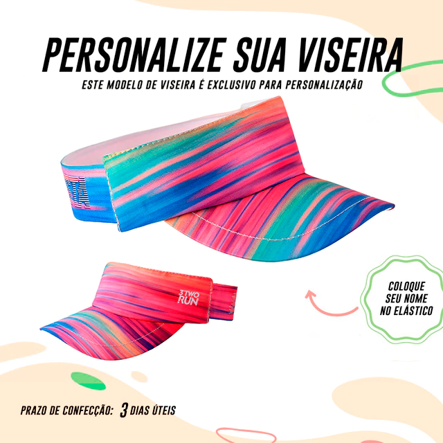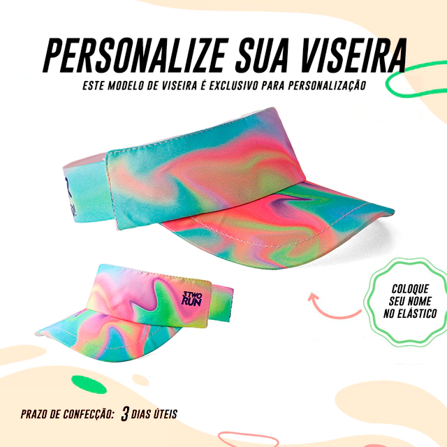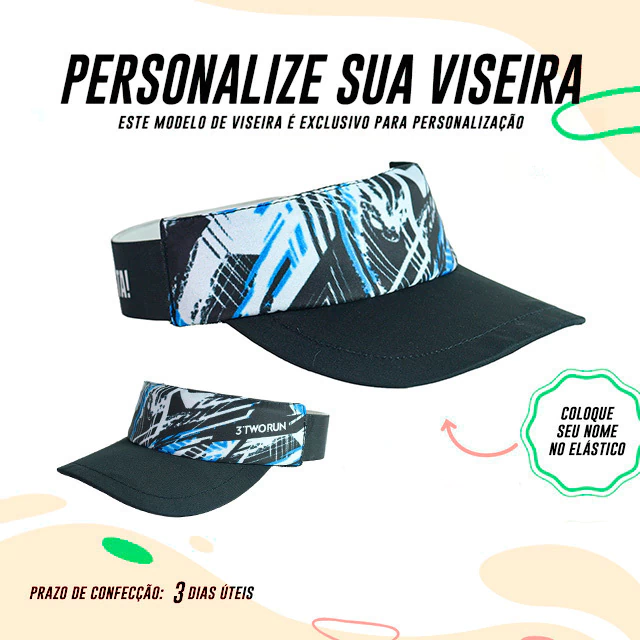 Agora você pode criar a sua viseira com o seu nome descrito na LATERAL. Lembrando que: TODAS as viseiras da 3TwoRun são confeccionadas com tecido de microfibra, de secagem rápida, com a parte interna atoalhada, a aba é feita com material expandido que não quebra e com elástico que se ajusta na sua cabeça.
